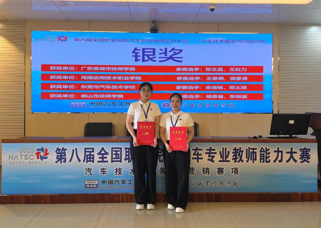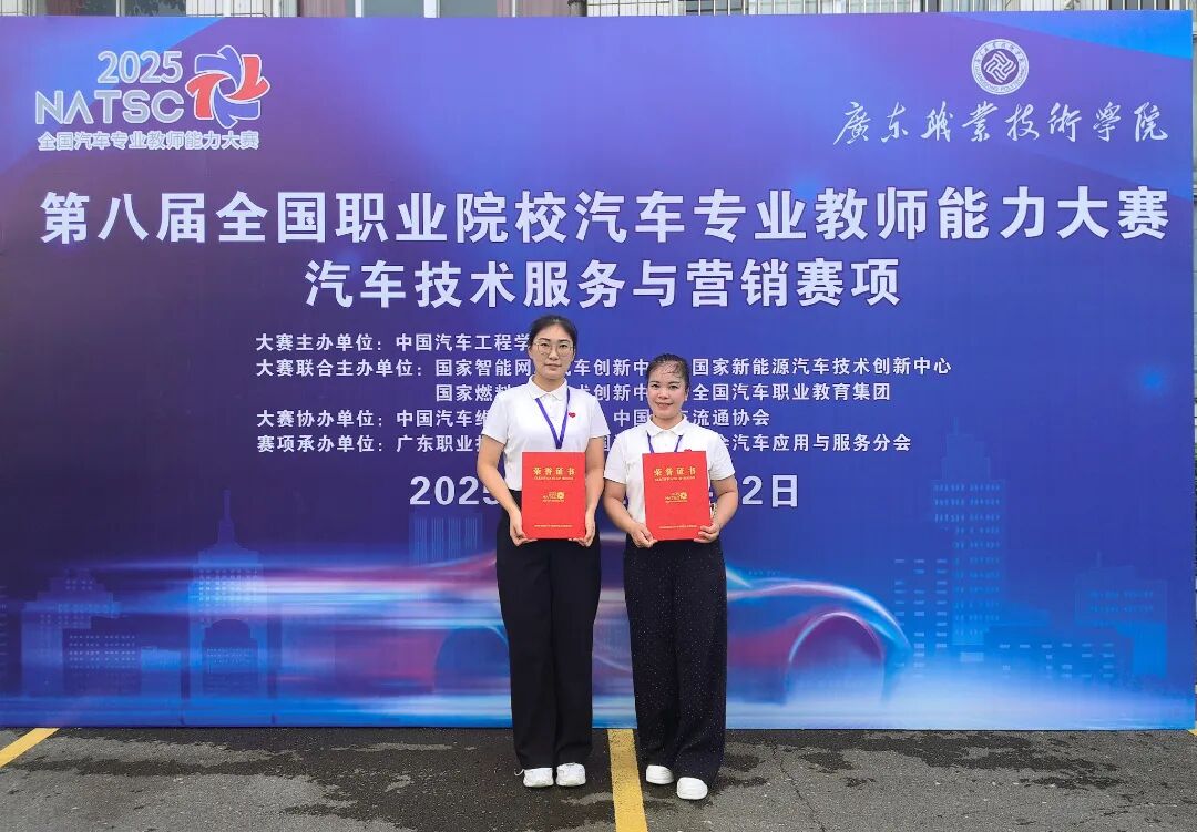 近日,2025NATSC全国汽车专业教师能力大赛暨第八届全国职业院校汽车专业教师能力大赛圆满落幕,比赛结果正式揭晓。我校交通运输学院教师张琳溪、姚惠雀在竞争激烈的 “汽车技术服务与营销”赛项中脱颖而出,凭借扎实的专业功底和出色的现场表现,一举斩获银奖。